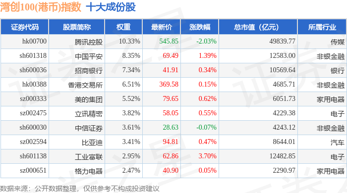 湾创100(港币)(980002)指数十大成份股详情如下: