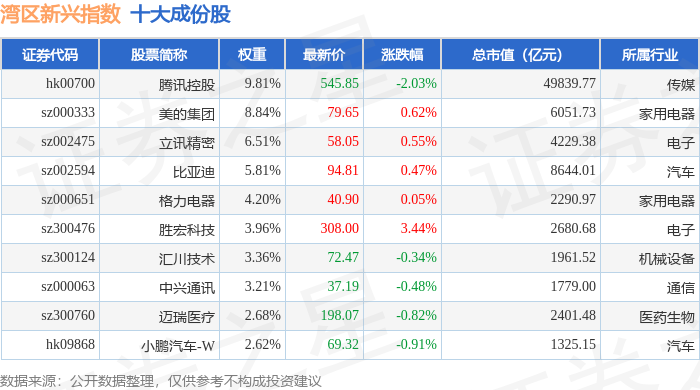 湾区新兴(980007)指数十大成份股详情如下: