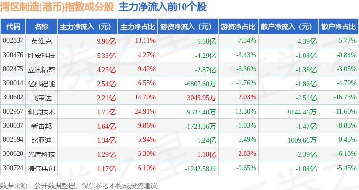 资金流向方面,湾区制造(港币)(980010)指数成份股当日主力资金净流出合计3.88亿元,游资资金净流出合计13.62亿元,散户资金净流入合计17.5亿元。成份股资金流向详情见下表: