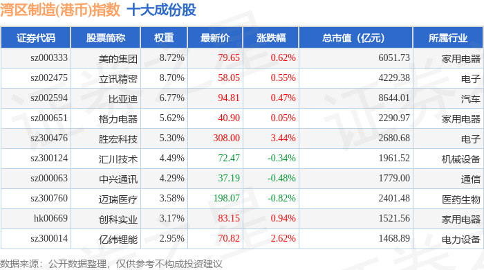 湾区制造(港币)(980010)指数十大成份股详情如下: