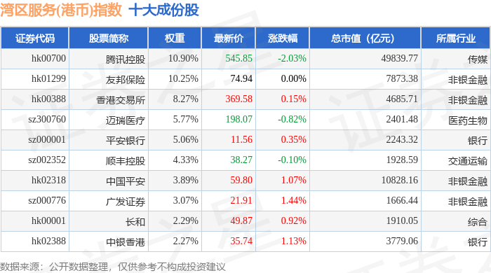 湾区服务(港币)(980012)指数十大成份股详情如下: