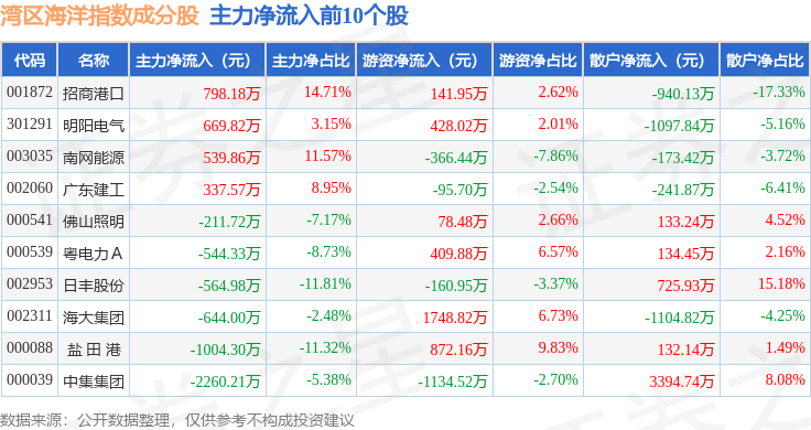 资金流向方面,湾区海洋(980019)指数成份股当日主力资金净流出合计2.2亿元,游资资金净流入合计5483.8万元,散户资金净流入合计1.65亿元。成份股资金流向详情见下表: