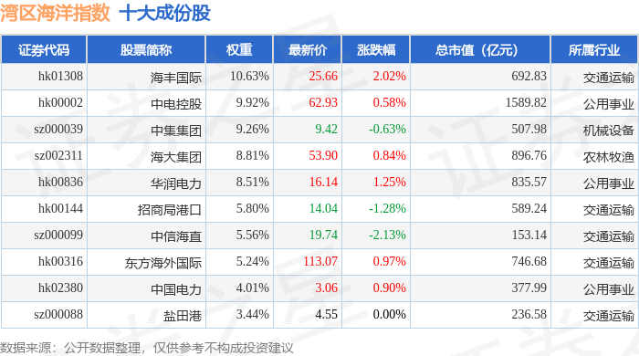 湾区海洋(980019)指数十大成份股详情如下: