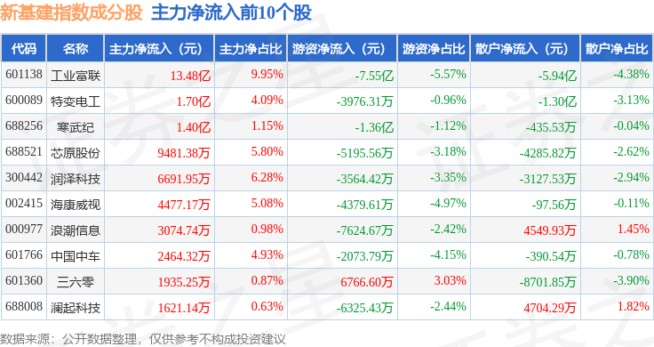 资金流向方面,新基建(980029)指数成份股当日主力资金净流出合计23.64亿元,游资资金净流入合计5.94亿元,散户资金净流入合计17.7亿元。成份股资金流向详情见下表:
