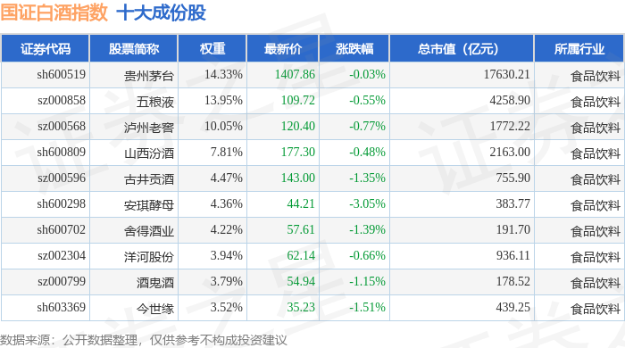 证券之星消息,12月23日,国证白酒(980031)指数报收于64452.66点,跌0.78%,成交91.2亿元,换手率0.53%。当日该指数成份股中,下跌的有26家,安琪酵母以3.05%的跌幅领跌。