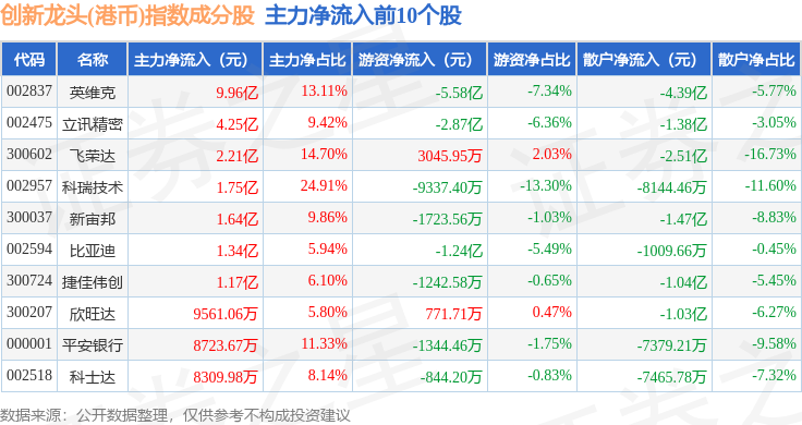 资金流向方面,创新龙头(港币)(980037)指数成份股当日主力资金净流出合计4.58亿元,游资资金净流出合计6.29亿元,散户资金净流入合计10.86亿元。成份股资金流向详情见下表: