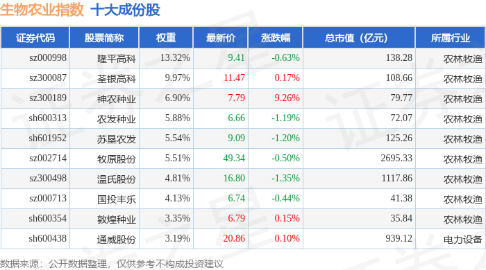 近10日内生物农业(980072)指数成份股做了调整,新纳入了7只股票,剔除了7只股票。