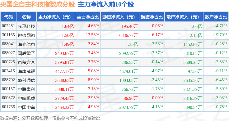 资金流向方面,央国企自主科技(980083)指数成份股当日主力资金净流出合计21.26亿元,游资资金净流入合计6.85亿元,散户资金净流入合计14.41亿元。成份股资金流向详情见下表: