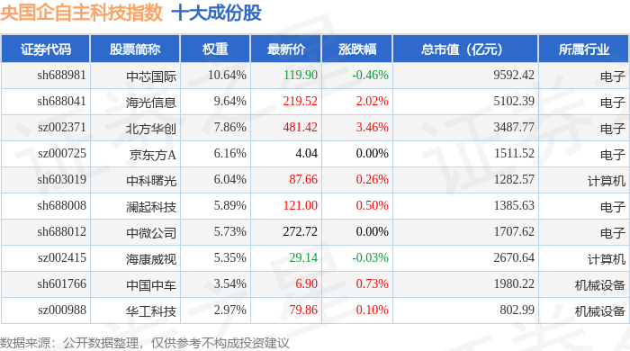 证券之星消息,12月23日,央国企自主科技(980083)指数报收于1802.35点,涨0.23%,成交644.05亿元,换手率1.31%。当日该指数成份股中,上涨的有17家,锐捷网络以3.56%的涨幅领涨,下跌的有29家,信科移动以5.4%的跌幅领跌。
