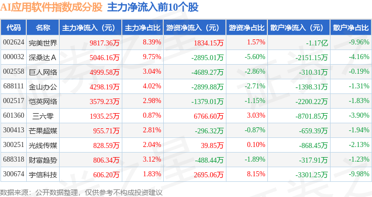 资金流向方面,AI应用软件(980107)指数成份股当日主力资金净流出合计14.55亿元,游资资金净流入合计3.57亿元,散户资金净流入合计10.97亿元。成份股资金流向详情见下表: