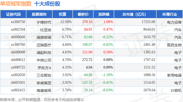 单项冠军(980150)指数十大成份股详情如下: