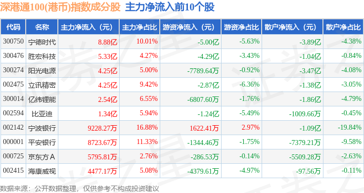 资金流向方面,深港通100(港币)(983008)指数成份股当日主力资金净流出合计15.26亿元,游资资金净流入合计5.0亿元,散户资金净流入合计10.27亿元。成份股资金流向详情见下表: