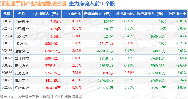 资金流向方面,深港通手机产业链(983009)指数成份股当日主力资金净流出合计22.4亿元,游资资金净流出合计1.63亿元,散户资金净流入合计24.03亿元。成份股资金流向详情见下表: