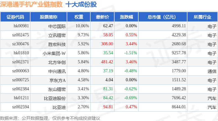 深港通手机产业链(983009)指数十大成份股详情如下: