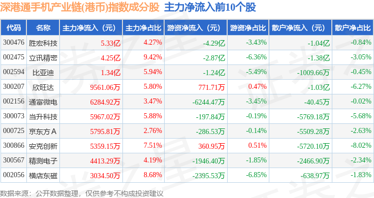 资金流向方面,深港通手机产业链(港币)(983010)指数成份股当日主力资金净流出合计22.4亿元,游资资金净流出合计1.63亿元,散户资金净流入合计24.03亿元。成份股资金流向详情见下表: