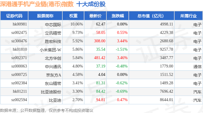 深港通手机产业链(港币)(983010)指数十大成份股详情如下: