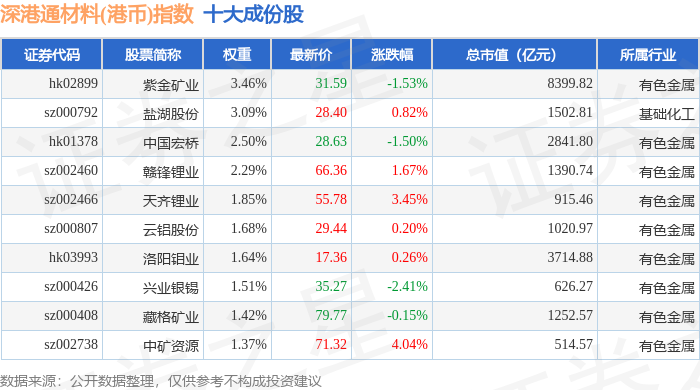 深港通材料(港币)(983016)指数十大成份股详情如下: