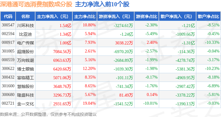 资金流向方面,深港通可选消费(983019)指数成份股当日主力资金净流出合计78.26亿元,游资资金净流入合计8.78亿元,散户资金净流入合计69.47亿元。成份股资金流向详情见下表: