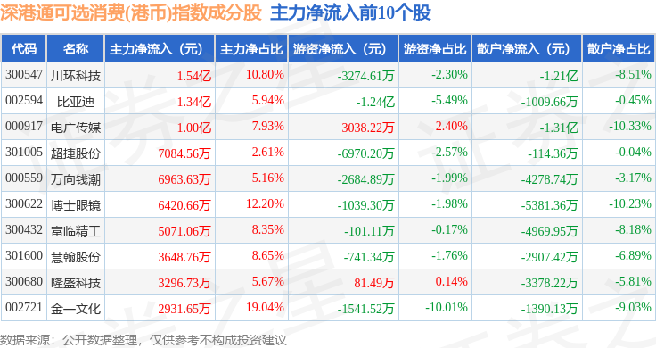 资金流向方面,深港通可选消费(港币)(983020)指数成份股当日主力资金净流出合计78.26亿元,游资资金净流入合计8.78亿元,散户资金净流入合计69.47亿元。成份股资金流向详情见下表: