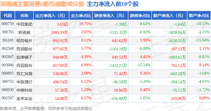 资金流向方面,深港通主要消费(港币)(983022)指数成份股当日主力资金净流出合计15.78亿元,游资资金净流入合计3940.6万元,散户资金净流入合计15.38亿元。成份股资金流向详情见下表: