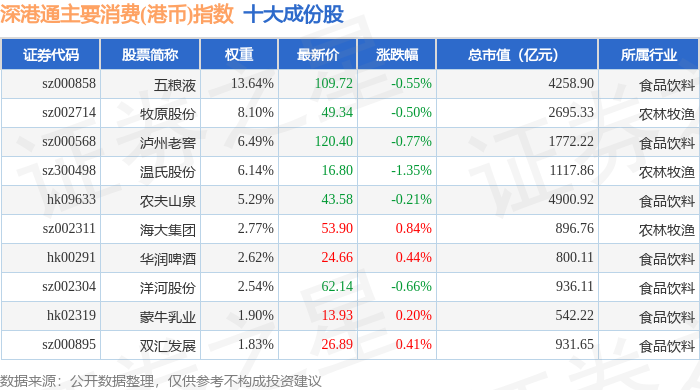 深港通主要消费(港币)(983022)指数十大成份股详情如下: