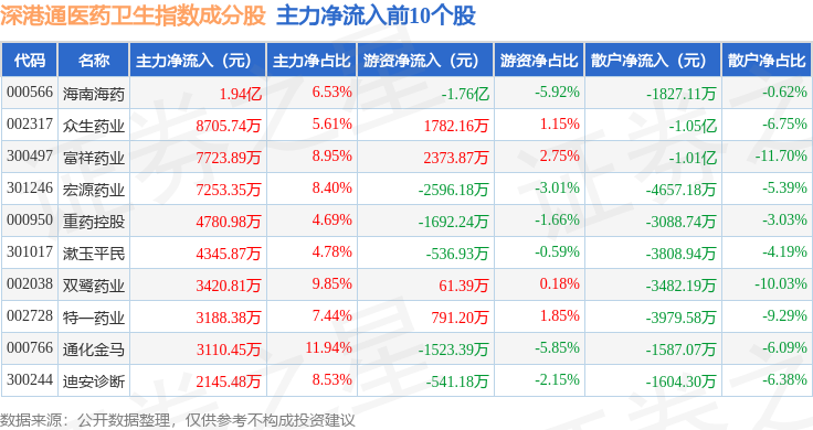 资金流向方面,深港通医药卫生(983023)指数成份股当日主力资金净流出合计12.52亿元,游资资金净流入合计4594.97万元,散户资金净流入合计12.06亿元。成份股资金流向详情见下表: