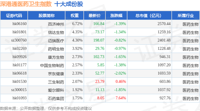 深港通医药卫生(983023)指数十大成份股详情如下: