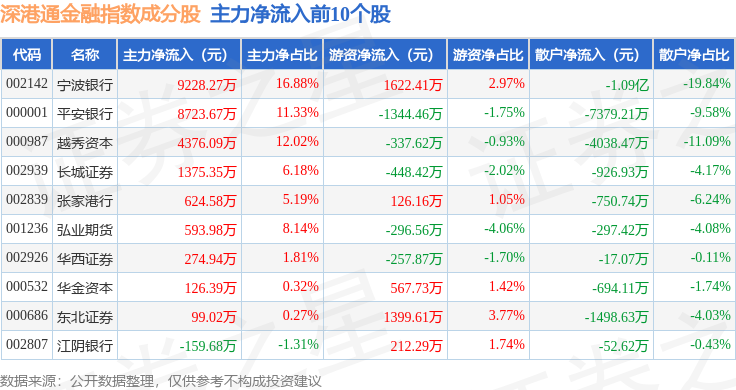 资金流向方面,深港通金融(983025)指数成份股当日主力资金净流出合计5.46亿元,游资资金净流入合计3.55亿元,散户资金净流入合计1.91亿元。成份股资金流向详情见下表: