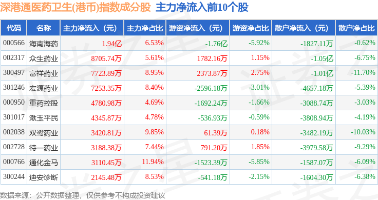 资金流向方面,深港通医药卫生(港币)(983024)指数成份股当日主力资金净流出合计12.52亿元,游资资金净流入合计4594.97万元,散户资金净流入合计12.06亿元。成份股资金流向详情见下表: