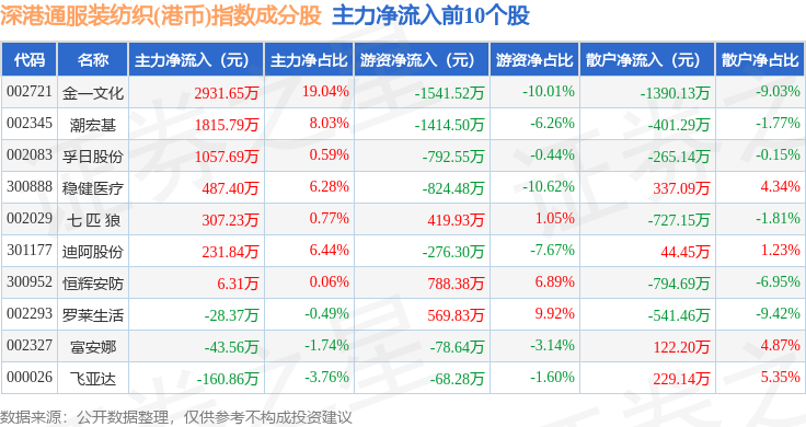 资金流向方面,深港通服装纺织(港币)(983042)指数成份股当日主力资金净流出合计1.2亿元,游资资金净流出合计1427.66万元,散户资金净流入合计1.35亿元。成份股资金流向详情见下表: