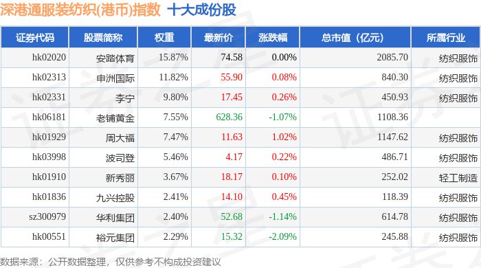 深港通服装纺织(港币)(983042)指数十大成份股详情如下: