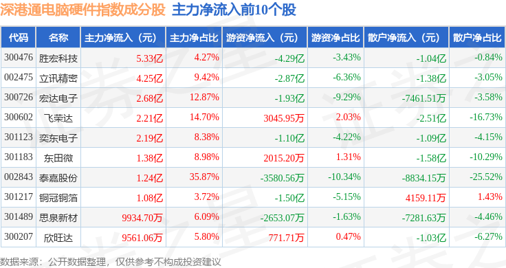 资金流向方面,深港通电脑硬件(983043)指数成份股当日主力资金净流出合计43.48亿元,游资资金净流出合计1.4亿元,散户资金净流入合计44.88亿元。成份股资金流向详情见下表: