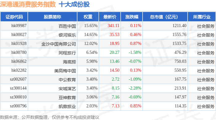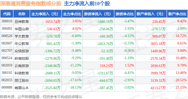 资金流向方面,深港通消费服务(983045)指数成份股当日主力资金净流出合计5.95亿元,游资资金净流出合计3673.26万元,散户资金净流入合计6.31亿元。成份股资金流向详情见下表:
