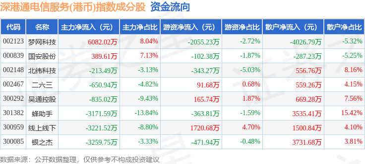 资金流向方面,深港通电信服务(港币)(983058)指数成份股当日主力资金净流出合计4880.68万元,游资资金净流出合计1358.54万元,散户资金净流入合计6239.21万元。成份股资金流向详情见下表: