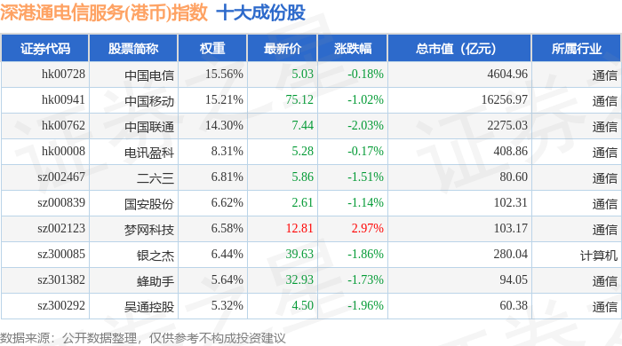 深港通电信服务(港币)(983058)指数十大成份股详情如下:
