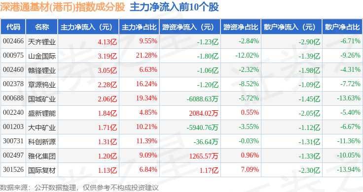 资金流向方面,深港通基材(港币)(983062)指数成份股当日主力资金净流出合计8635.56万元,游资资金净流出合计7.35亿元,散户资金净流入合计8.21亿元。成份股资金流向详情见下表: