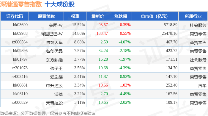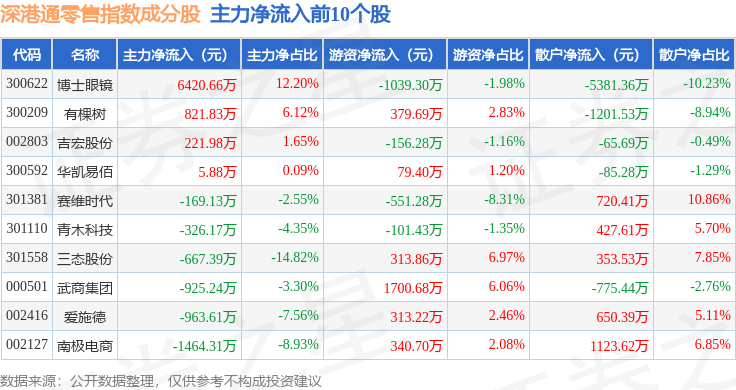 资金流向方面,深港通零售(983073)指数成份股当日主力资金净流出合计7.76亿元,游资资金净流入合计1.31亿元,散户资金净流入合计6.46亿元。成份股资金流向详情见下表: