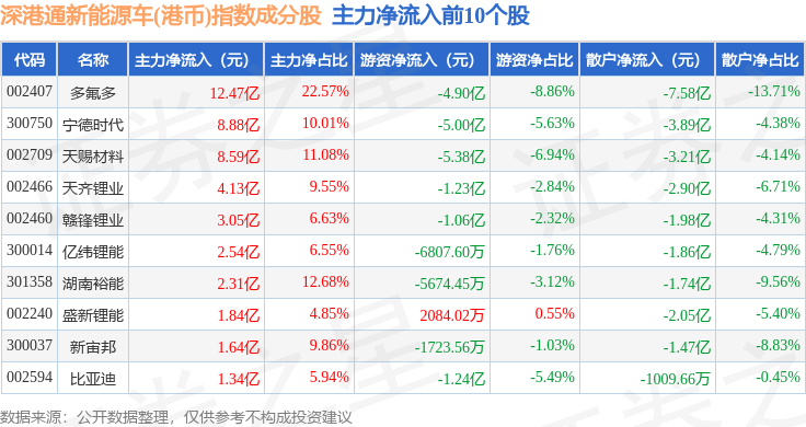 资金流向方面,深港通新能源车(港币)(983088)指数成份股当日主力资金净流入合计43.84亿元,游资资金净流出合计21.25亿元,散户资金净流出合计22.59亿元。成份股资金流向详情见下表:
