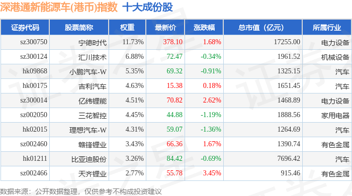 深港通新能源车(港币)(983088)指数十大成份股详情如下: