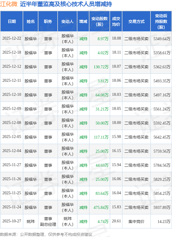 江化微近半年内的董监高及核心技术人员增减持详情如下:
