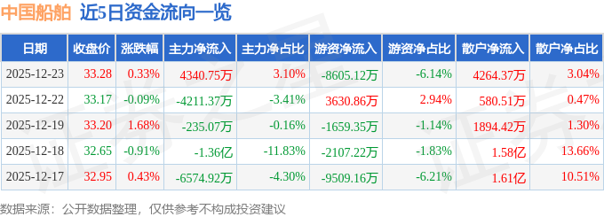 证券之星消息,截至2025年12月23日收盘,中国船舶(600150)报收于33.28元,上涨0.33%,换手率0.56%,成交量42.24万手,成交额14.02亿元。