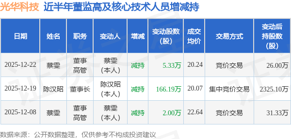 光华科技近半年内的董监高及核心技术人员增减持详情如下: