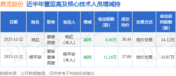 证券之星消息,根据12月23日市场公开信息、上市公司公告及交易所披露数据整理,鼎龙股份(300054)最新董监高及相关人员股份变动情况:2025年12月22日公司董秘,董事,高管杨平彩、董事,高管姚红共减持公司股份19.29万股,占公司总股本为0.0203%。变动期间公司股价上涨6.04%,12月22日当日收盘报38.63元。