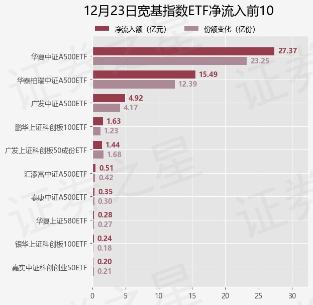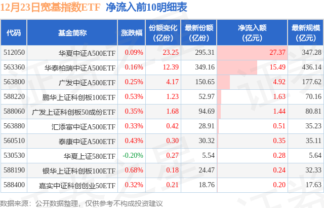 当日有24只宽基指数ETF基金出现资金净流入,其中净流入排首位的是华夏中证A500ETF(512050),份额增加了23.25亿份,净流入额为27.37亿元。
