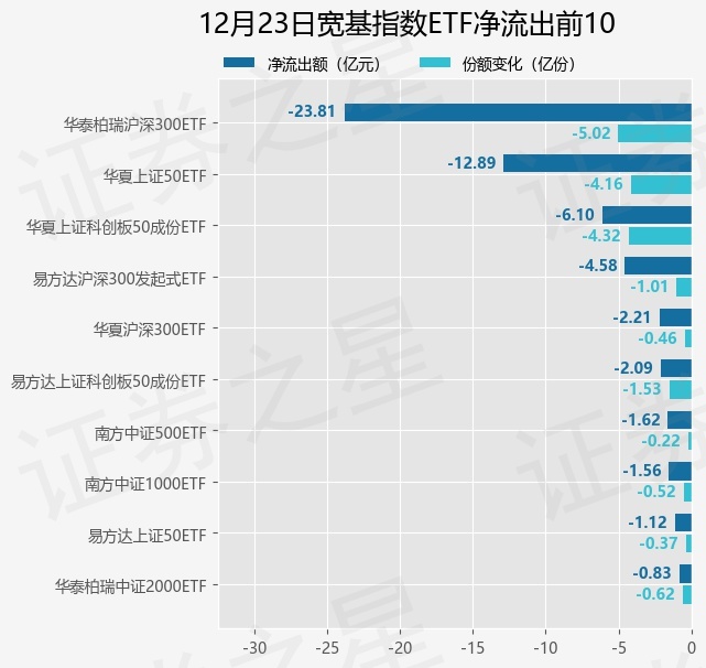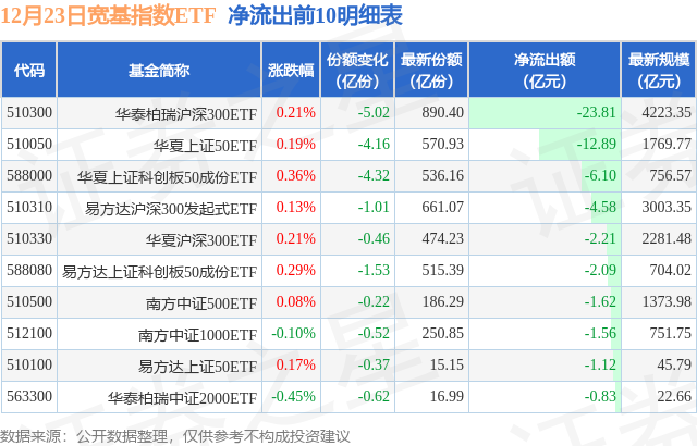 当日有94只宽基指数ETF基金出现资金净流出,其中净流出排首位的是华泰柏瑞沪深300ETF(510300),份额减少了5.02亿份,净流出额为23.81亿元。
