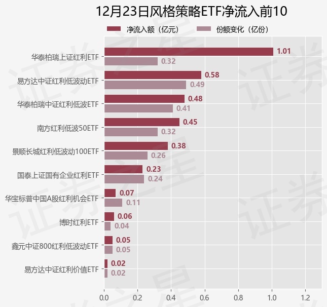 当日有11只风格策略ETF基金出现资金净流入,其中净流入排首位的是华泰柏瑞上证红利ETF(510880),份额增加了3200.0万份,净流入额为1.01亿元。