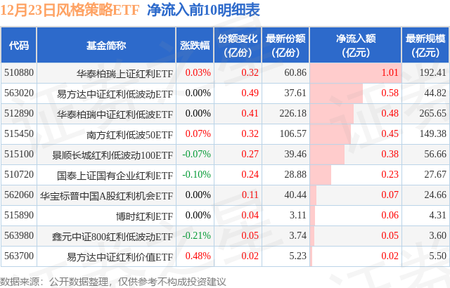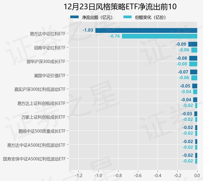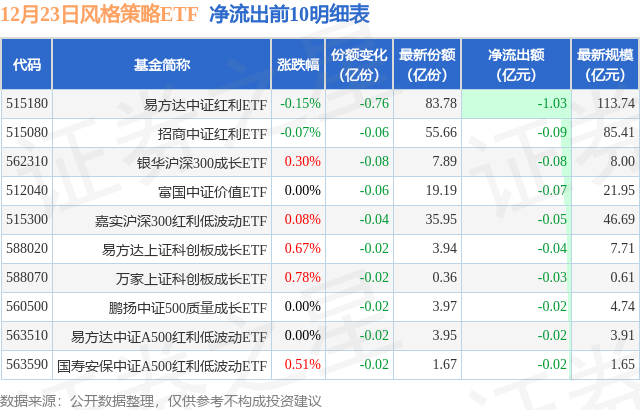 当日有12只风格策略ETF基金出现资金净流出,其中净流出排首位的是易方达中证红利ETF(515180),份额减少了7600.0万份,净流出额为1.03亿元。