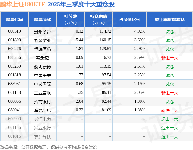 鹏华上证180ETF基金成立于2024年12月25日,基金经理为余展昌,基金跟踪标的为上证180指数,成立以来超额回报为3.31%,近一个月超额回报为0.14%。最新披露的基金持仓数据显示,截止2025年9月30日,该基金第一大重仓股为贵州茅台(600519),持股占比为4.02%。