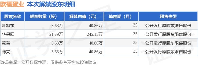 证券之星消息,根据市场公开信息整理,欧福蛋业(920371)于12月24日将有32.69万股限售股份解禁,为公司公开发行原股东限售股份,占公司总股本0.16%。(本次数据根据历史公告整理得出,实际情况以上市公司最新公告为准)最近一年内,该股累计解禁1.36亿股,占总股本的66.19%。本次解禁后,公司还有1153.83万股限售股份,占总股本5.62%。具体如下图所示: