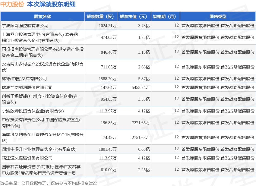证券之星消息,根据市场公开信息整理,中力股份(603194)于12月24日将有1.07亿股限售股份解禁,为公司首发原股东限售股份,首发战略配售股份,占公司总股本26.58%。(本次数据根据历史公告整理得出,实际情况以上市公司最新公告为准)最近一年内,该股累计解禁162.67万股,占总股本的0.41%。本次解禁后,公司还有2.43亿股限售股份,占总股本60.59%。具体如下图所示: